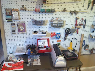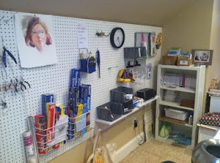 After stalking Pinterest, I decided to put up some pegboard.  I began by measuring my space.  Then I went to Lowe’s and got some pegboard.  I had already attached 2X2 furring strips to the walls where I wanted the pegboard to go.  When I got the pegboard, I had them cut it at the store to fit the dimensions of my walls.  I decided to do 2 of the 3 walls that surround my work table.   Then I began to shop for things use in order to hang stuff on the walls.  OMG…so much to choose from if you are near an IKEA, but I’m not…I only had Lowe’s.  So I had to get a little creative.