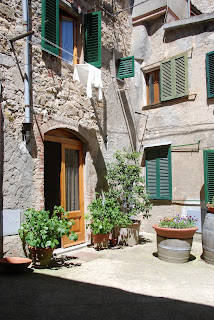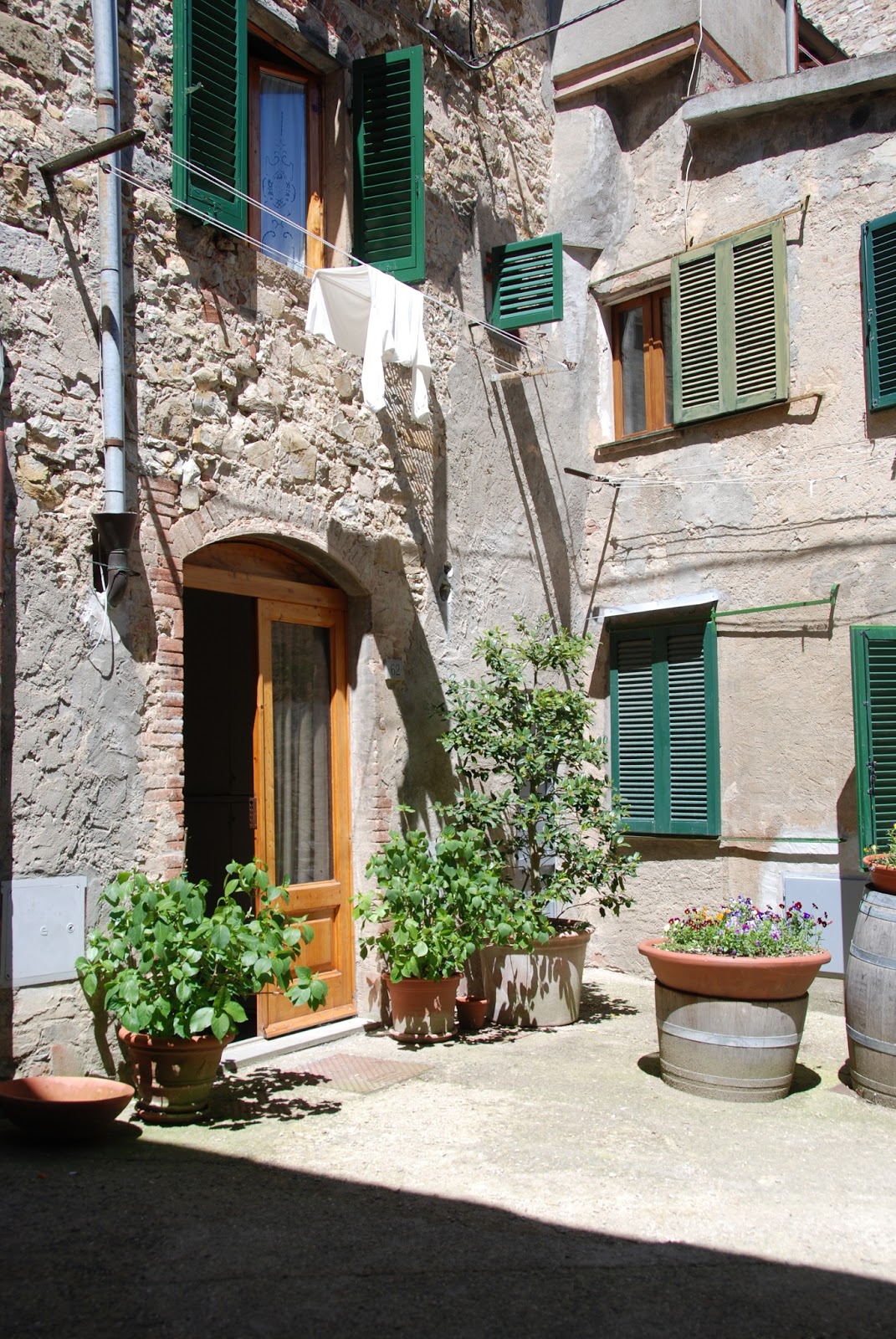 I took a few photos at first and tried to find a place that called to me to be painted.  This one was quiet, and I had a vantage point that was in the shade without anyone around.  I decided to try my hand at this.  At first I did a sketch in my mini sketch book with an elegant writer marker.  I then took a brush with water and made the lines bleed.  This is a really fun value foundation for painting.  I then added my watercolors for a little more color and the paper got a bit mushy. Once nice thing that happened is that a bunch of other students joined me in my little corner and we had fun painting together.  The lady who lives there also was kind enough to hang a shirt on the line for me.  I was going to have to  make up some laundry so that was very fortunate. Later on, the lines above were filled with laundry too.  I guess that’s what happens on sunny days in Tuscany!