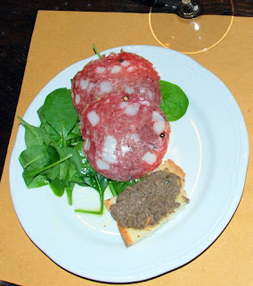Last night’s Anti- pasti: Tuscan Salame with large peppercorns, spinachini (baby spinach), and home made chicken liver pate’ on Tuscan toast