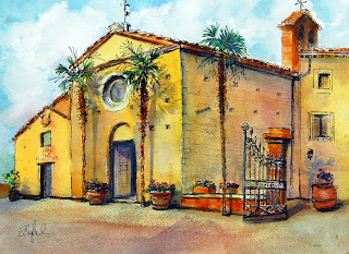 Our home base in Tuscany was the restored former monastery of San Fedele. Such a romantic place! That was the intention of this painting…to capture the romance of the location there. I decided to give the wrought iron fence some prominence and push the lighting to create a sense of warmth. I hope these paintings give you an idea of how wonderful it can be to augment your travels by capturing your memories through photography, drawing and painting. That’s why I’m on another art oriented trip…I can’t get enough!