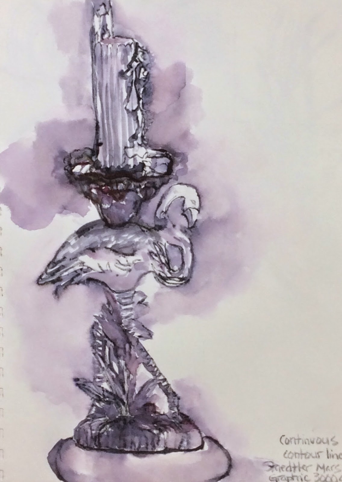 The list could go on, but these are all great! If you have a drawing tool at home that you purchased but never used, now is your chance to try it out. I got the Staedtler Mars Graphic 3000 marker out for this exercise, and enjoyed doing a contour drawing of a candlestick. The marker lines can be softened with water for watercolor effects that lean toward a mauve/violet hue. I liked it! You might too!