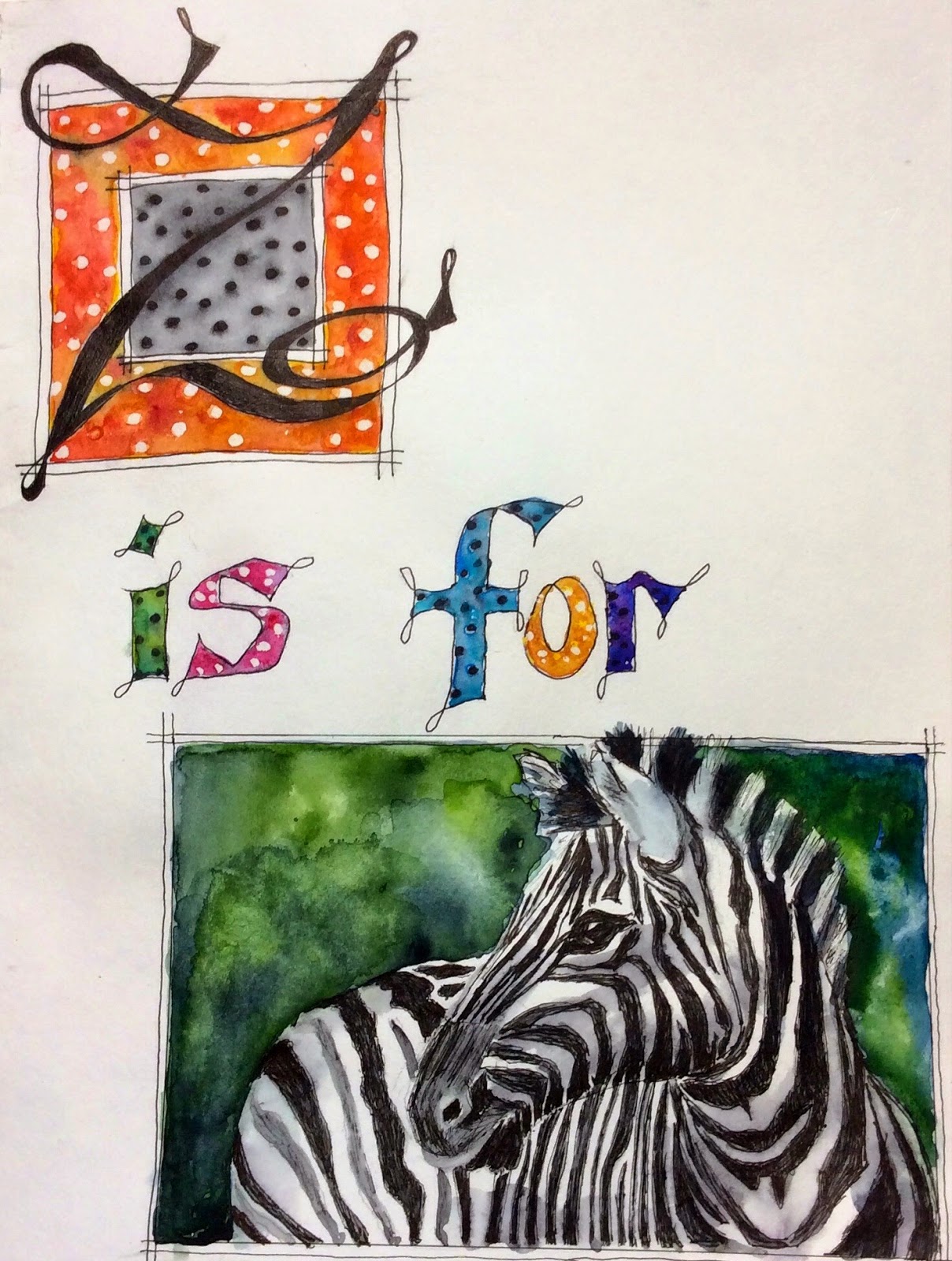 Z is for Zebra ©Rebecca Zdybel My sketch is done with permanent archival ink (micron o4 black) and watercolor |