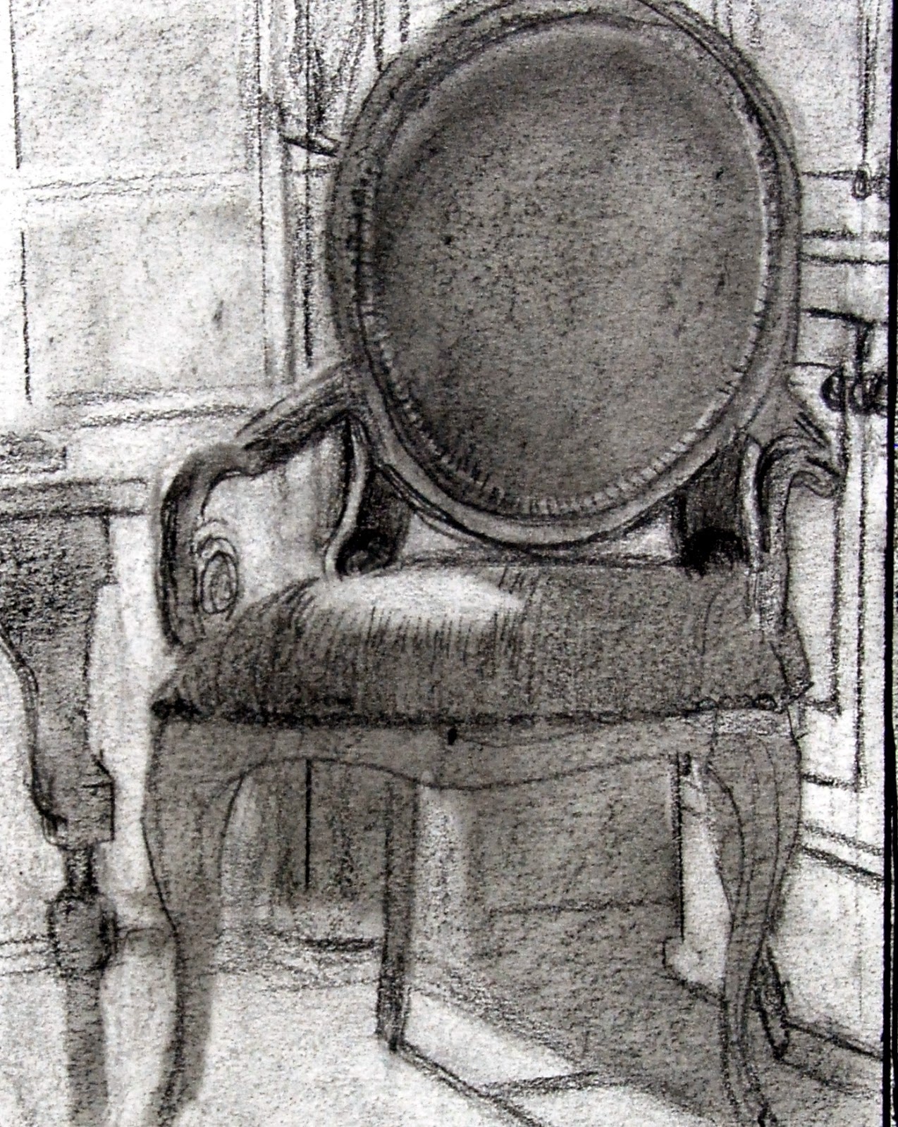 Another Hint: Sometimes drawing a chair by drawing the negative spaces can make everything fit together a bit easier. This is a tried and true technique from Drawing on the Right Side of the Brain by Betty Edwards. You may want to try it with these chair photos, or you may draw your own if you prefer. If you wish to draw the negative spaces, taking a photograph is the easiest way to frame your shot and flatten the image. Send it to your printer and you’re ready to draw! For more instructions on this way to draw follow this link: 30 Day Drawing Challenge day 6- Complex Negative Image and 30 Day Drawing Challenge Day 5- Think positively about drawing Negatively