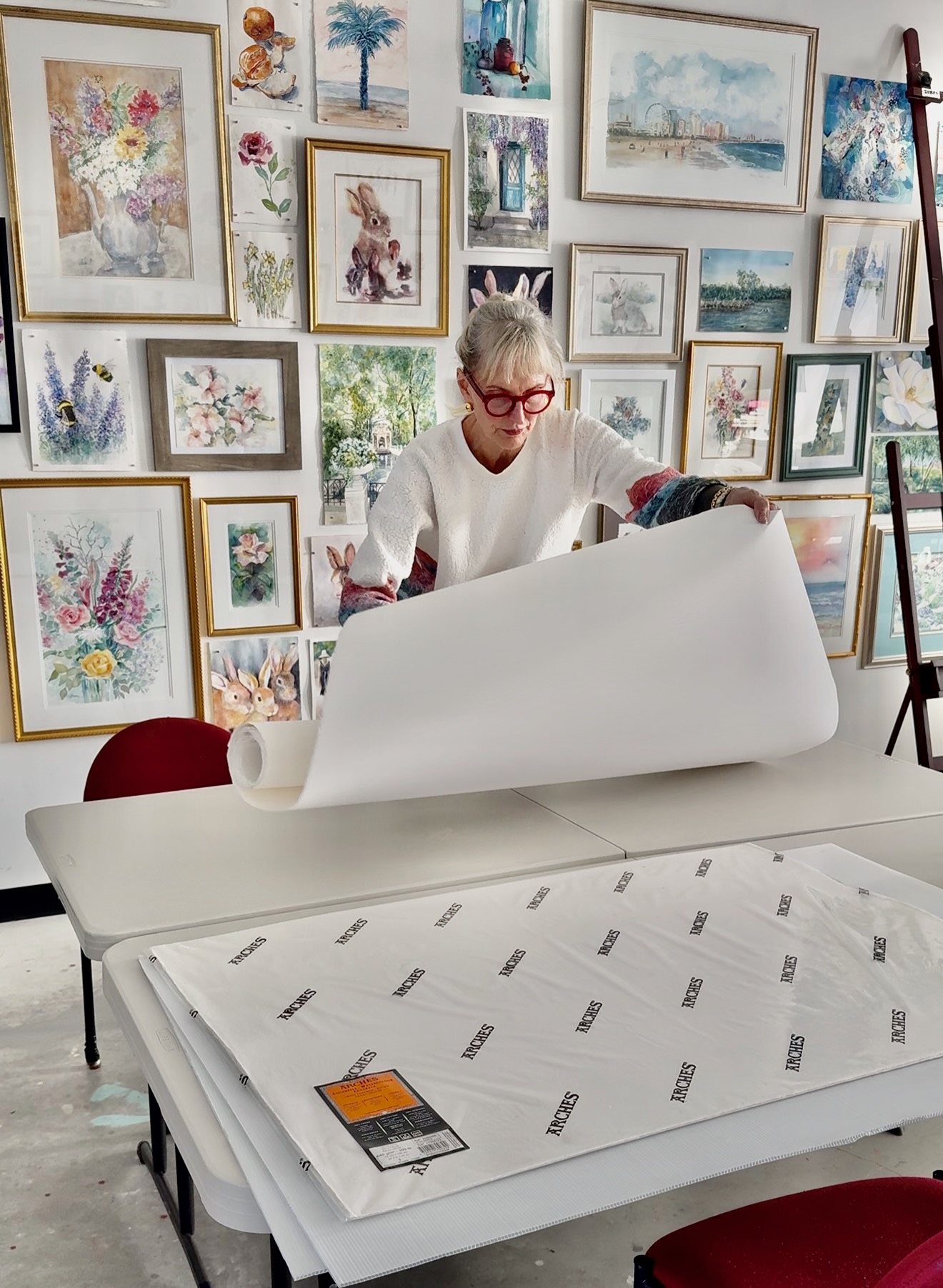 The final size: 33 x 42 inches. Larger than any pre-cut manufactured paper I had on hand. Larger than even than my elephant size watercolor paper! That meant pulling out a big roll of 140 lbs Moulin du Roy watercolor paper.
